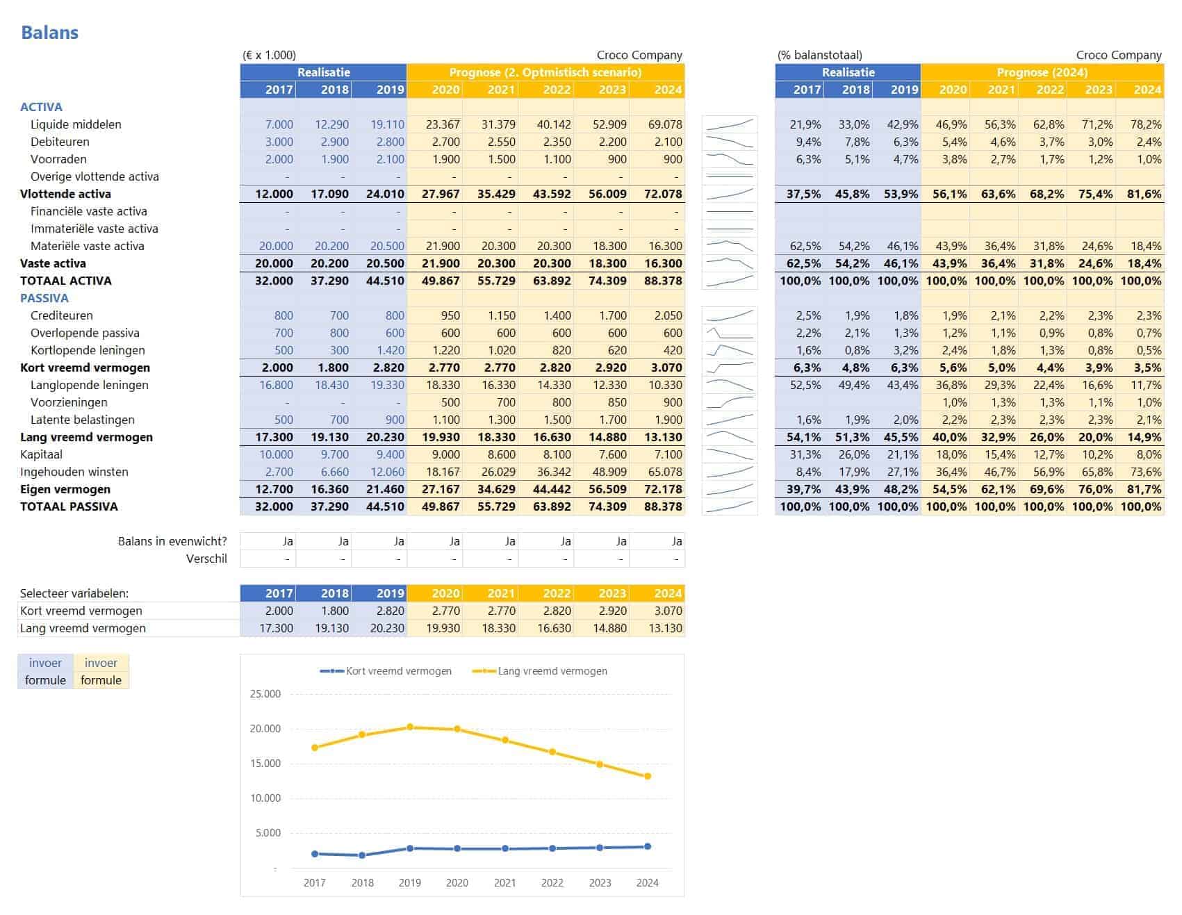 - 4 scenario’s met aannames die automatisch van invloed zijn op de 3 financiële rapportages (basis, optimistisch, pessimistisch, alternatief).