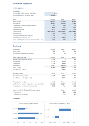 Vergelijk met deze template tot 3 auto’s met elkaar. Welke auto is goedkoper als je kijkt naar de vaste en variabele kosten per jaar of per kilometer?