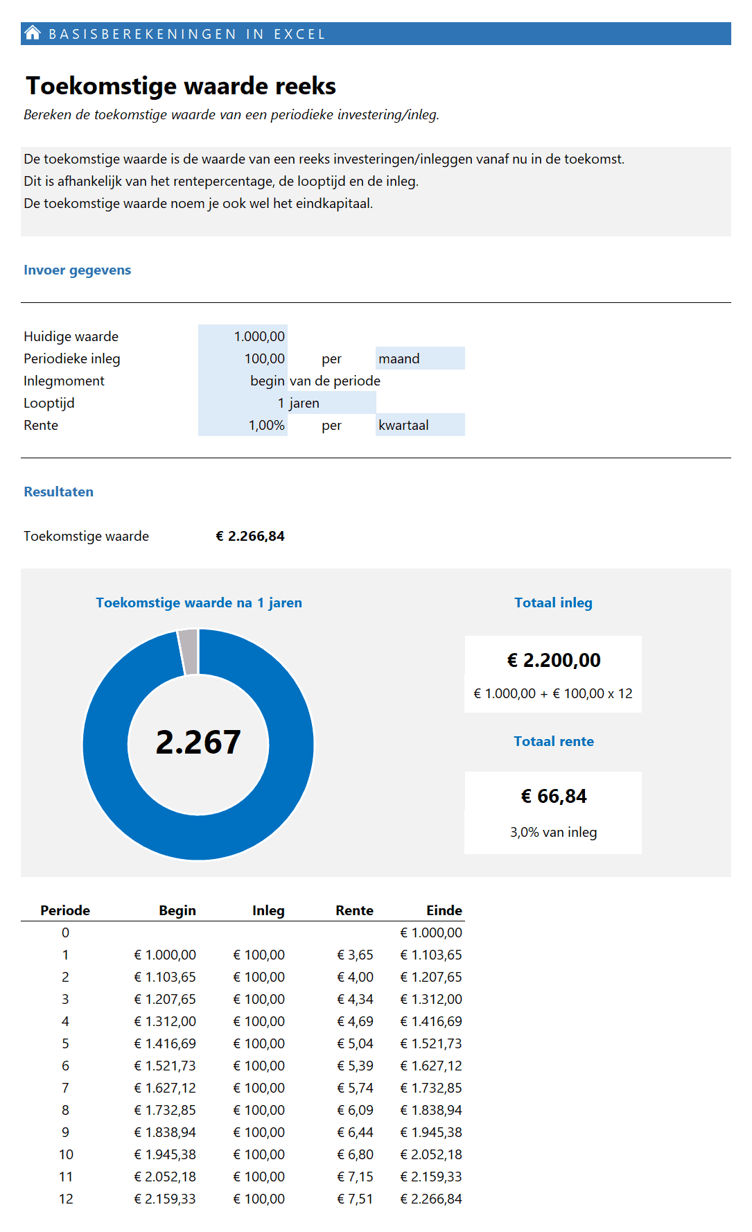 Bereken de toekomstige waarde van een periodieke inleg/investering. De toekomstige waarde is de waarde van een reeks investeringen/inleggen vanaf nu in de toekomst. Dit is afhankelijk van het rentepercentage, de looptijd en de inleg. De toekomstige waarde noem je ook wel het eindkapitaal.