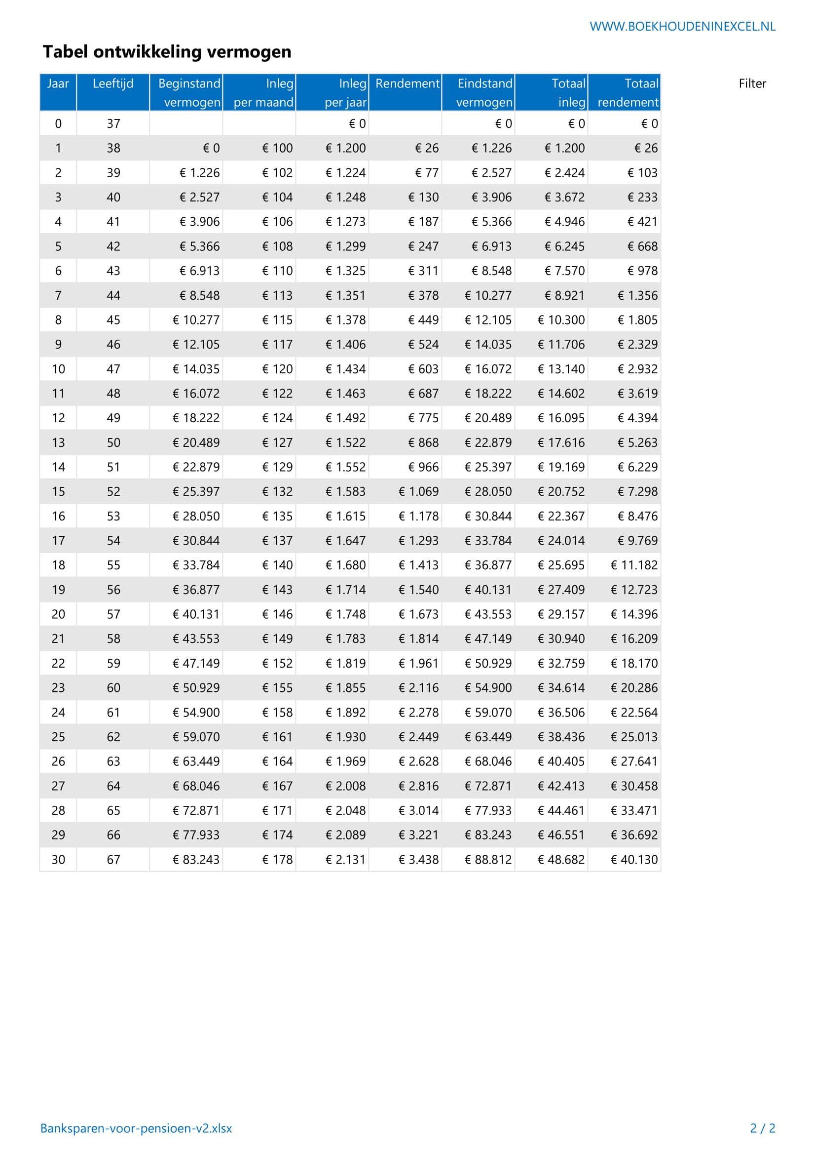 Voor de volledigheid vind je ook een tabel met resultaten, zodat je kunt zien wat bijvoorbeeld je vermogen op een bepaalde leeftijd is.