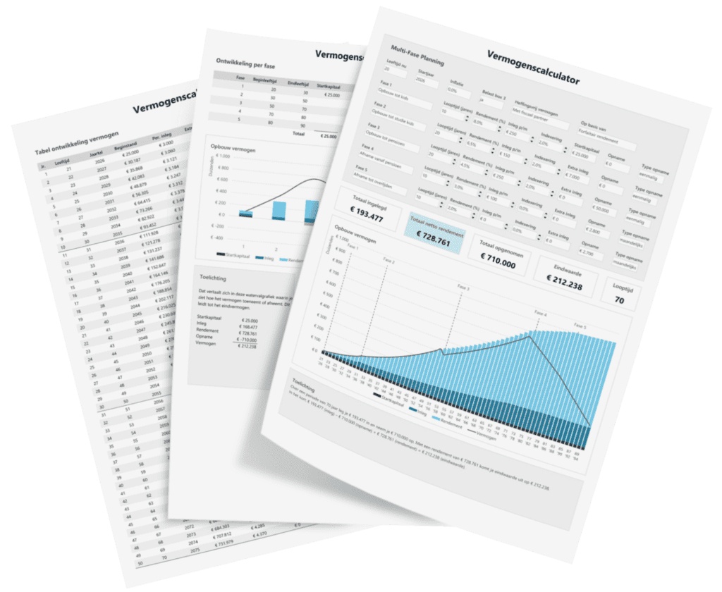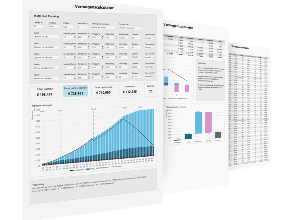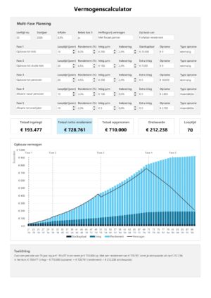 In plaats van één simpele berekening werk je met meerdere fases waarin je per periode jouw eigen aannames invult, zoals rendement, maandelijkse inleg, indexering en eventuele opnames. Hierdoor kun je realistische scenario’s doorrekenen, zoals extra opbouw richting pensioen, een grote opname voor studie of woning, en een geplande afbouw van vermogen na pensionering.