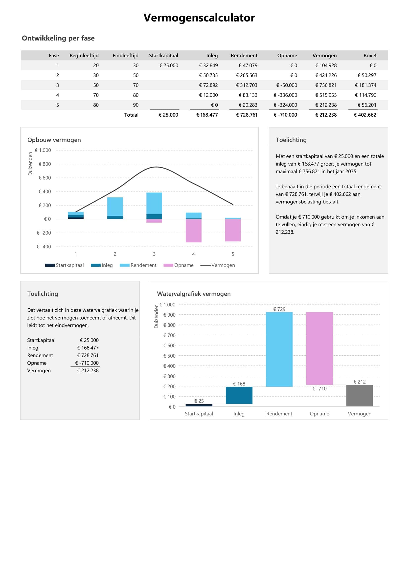 Inclusief grafieken, fase-overzicht en een complete jaar-tot-jaar vermogensanalyse.