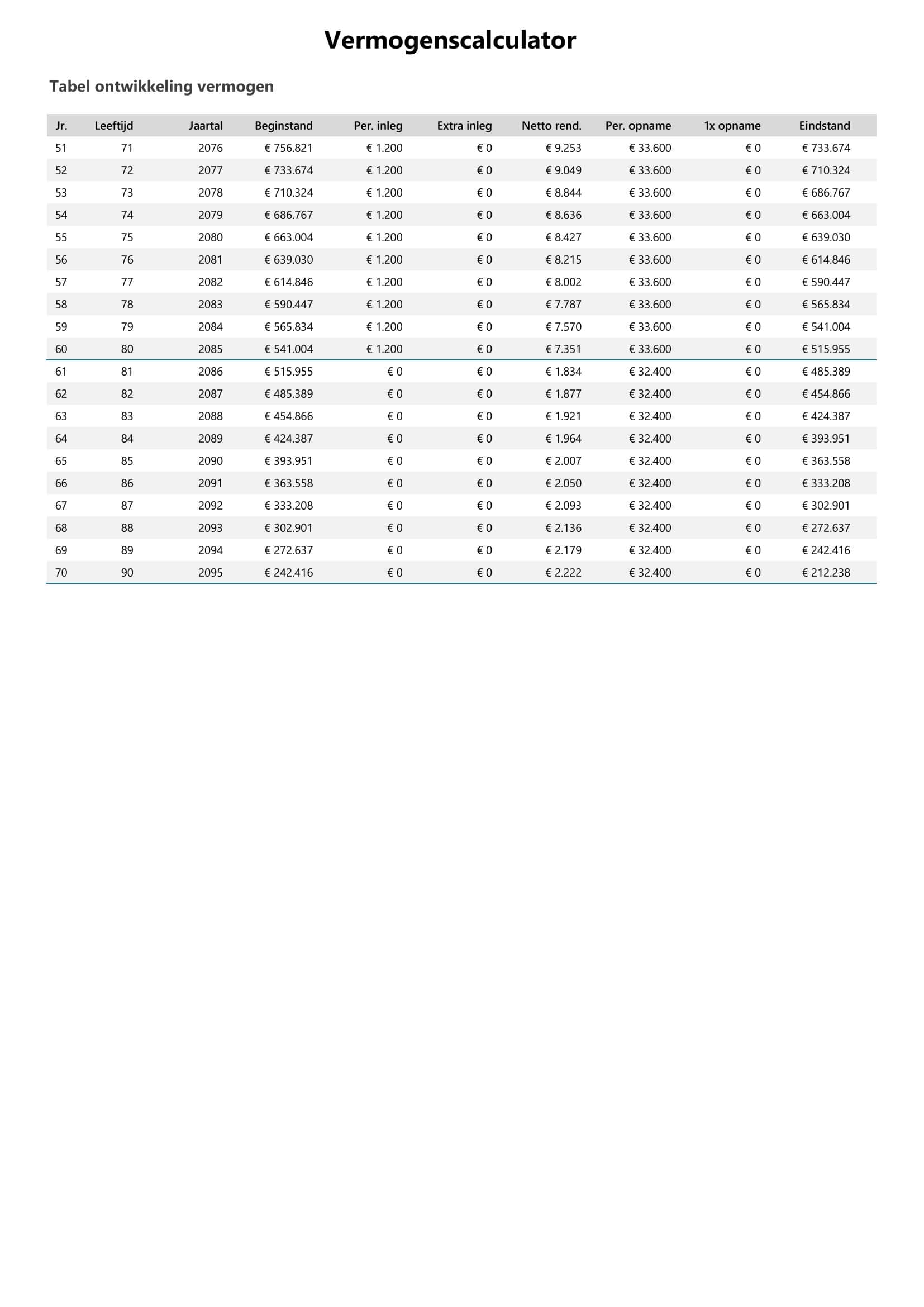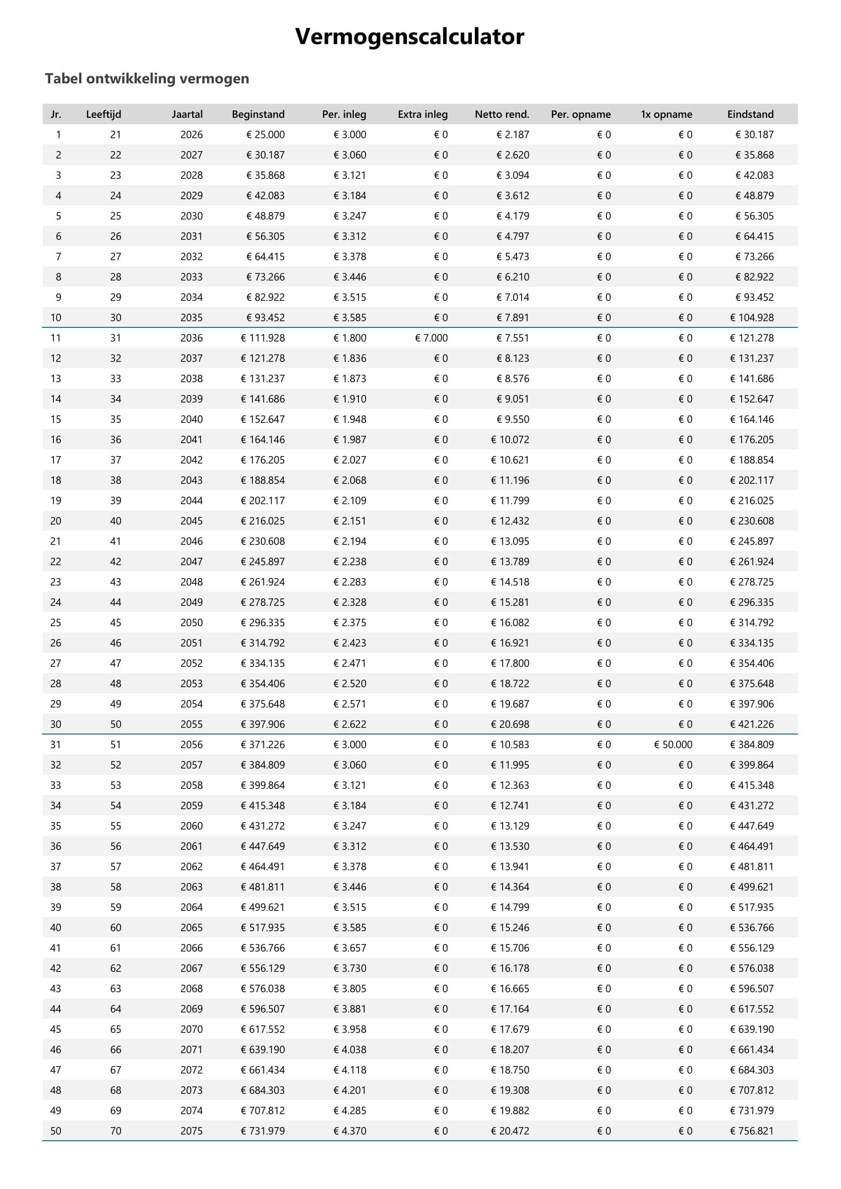 De tool bevat ook een volledige jaarontwikkelingstabel waarin je per jaar ziet:
