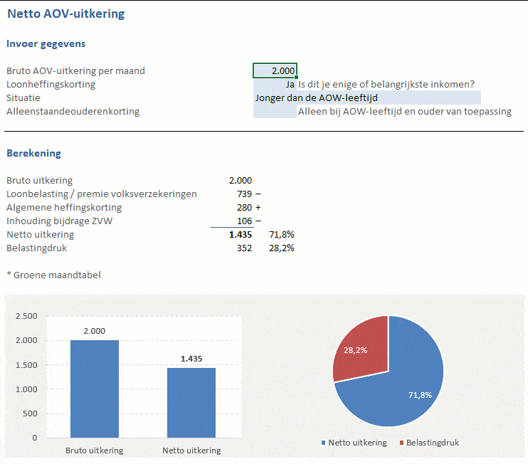 - De netto uitkering wordt nu voor je uitgerekend op basis van de groene maandtabel (niet-werkenden, bijv. pensioen- of lijfrente-uitkeringen en AOW-uitkeringen).