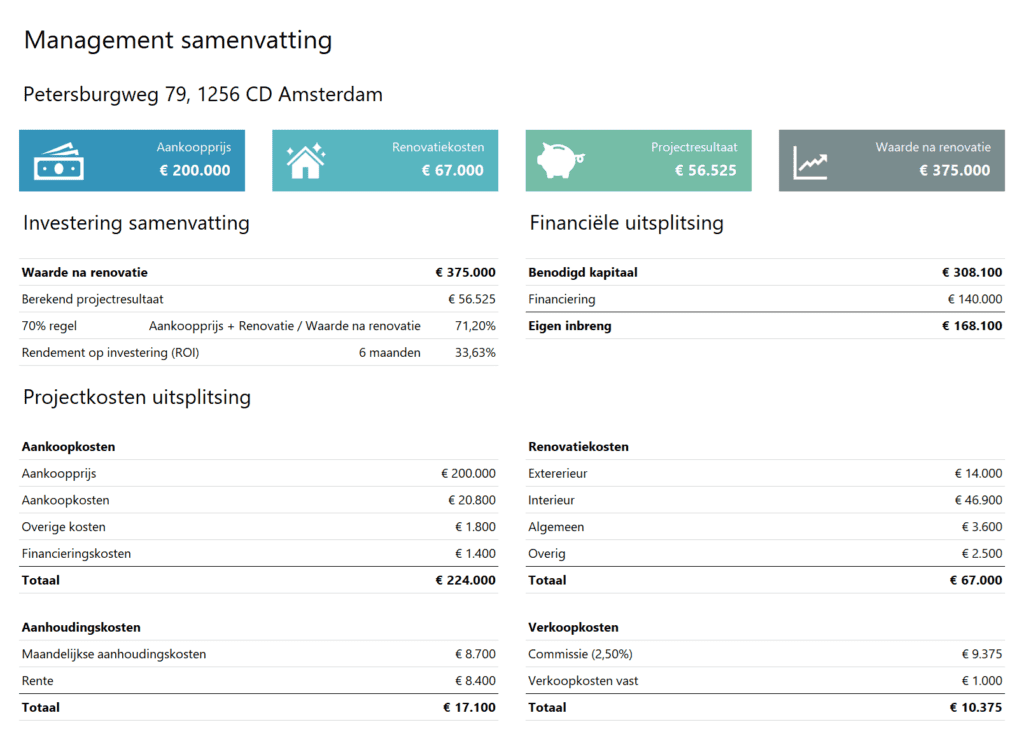 De financiële analyse vertelt je hoeveel geld je nodig hebt en wat je eigen inbreng is. Het toont verder gegevens over de financiering en het verwachte projectresultaat in een tijdlijn. Hoe langer de verbouwing duurt, hoe lager het resultaat.