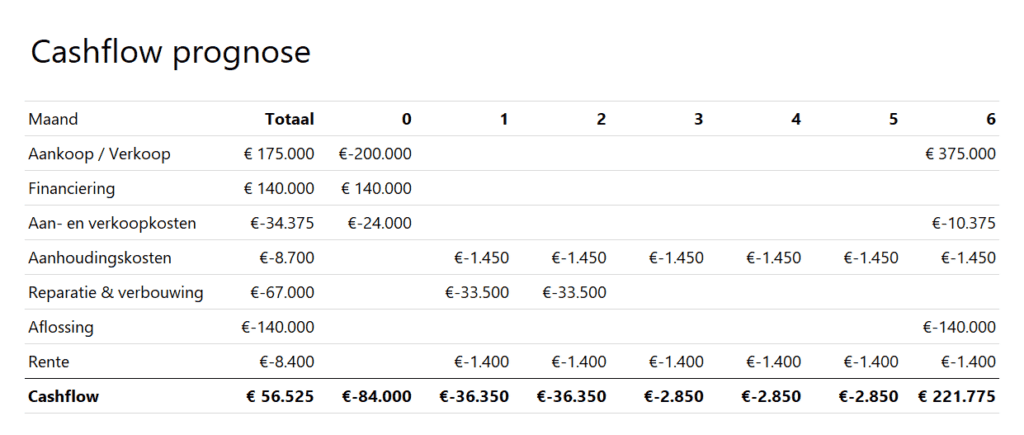 De cashflowprognose alle inkomsten en uitgaven, zoals de aan- en verkoop, financiering, renovatie, aanhoudingskosten, rente en aflossing tot maximaal 36 maanden.