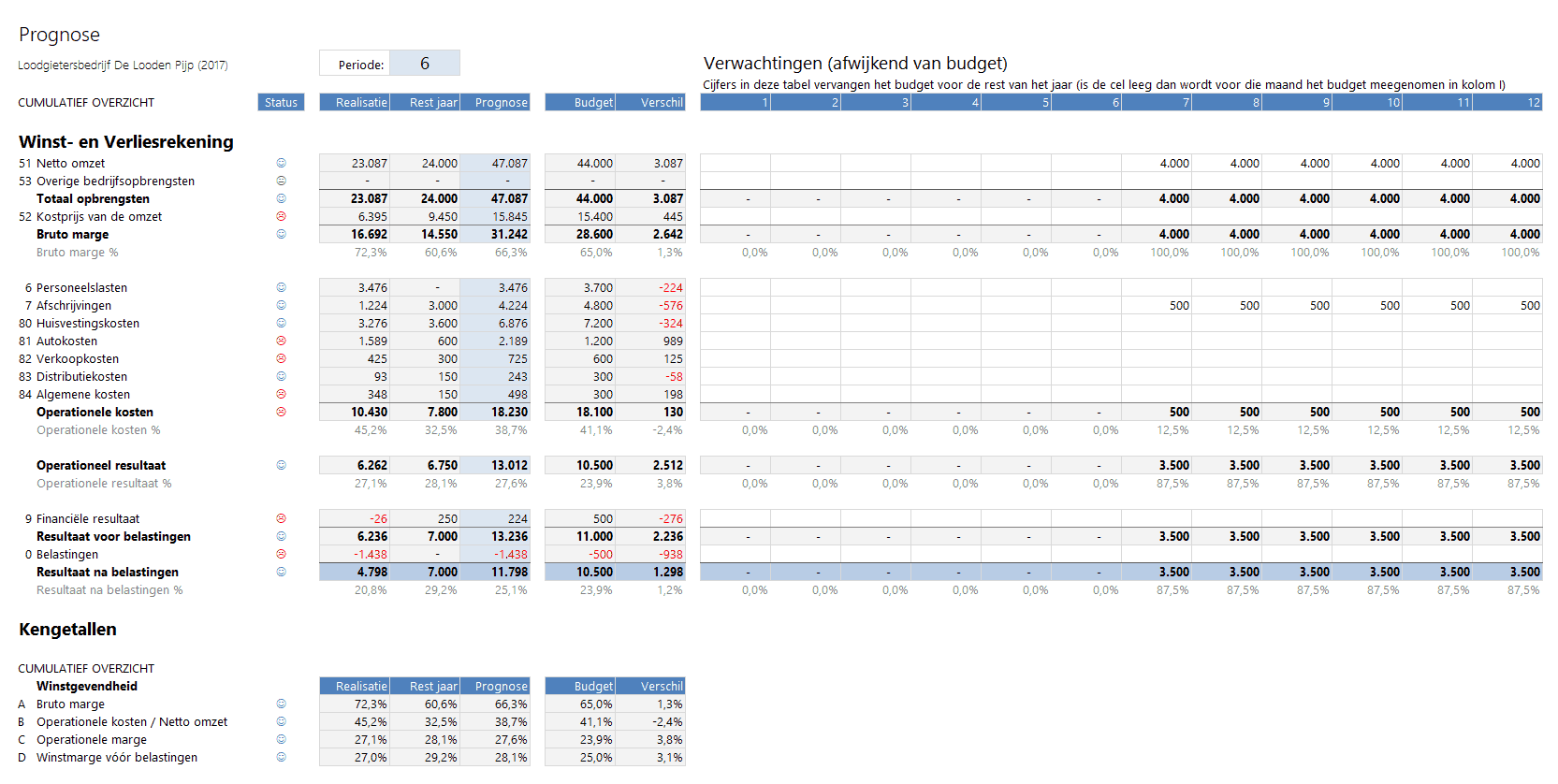 Met Boekhouden in Excel kon je al je actuele cijfers vergelijken met je budget of cijfers van het vorige jaar. Vanaf Boekhouden in Excel 5.0 kun je ook een prognose van je winst bekijken. Deze template vult de gerealiseerde cijfers aan met het budget voor de rest van het jaar en/of de prognosecijfers die je hebt ingevuld.